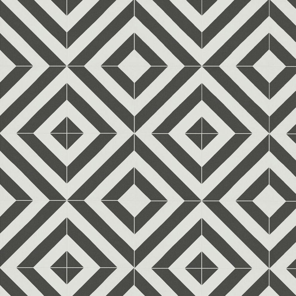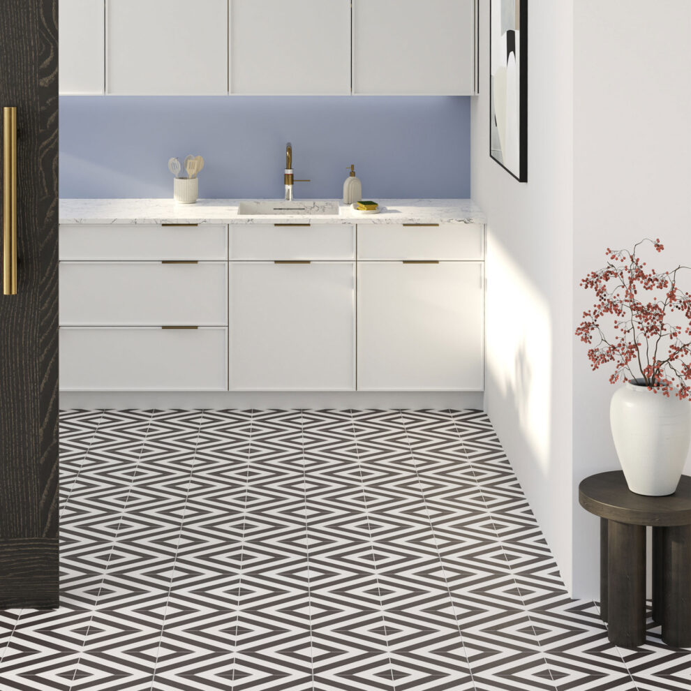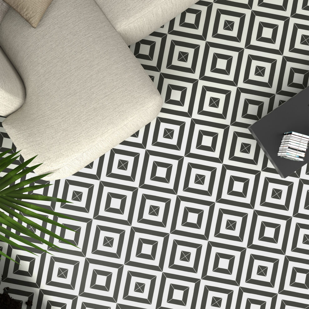 Le revêtement de sol stratifié Black & White Pattern Tile, un design attrayant avec une touche rétro et élégante.