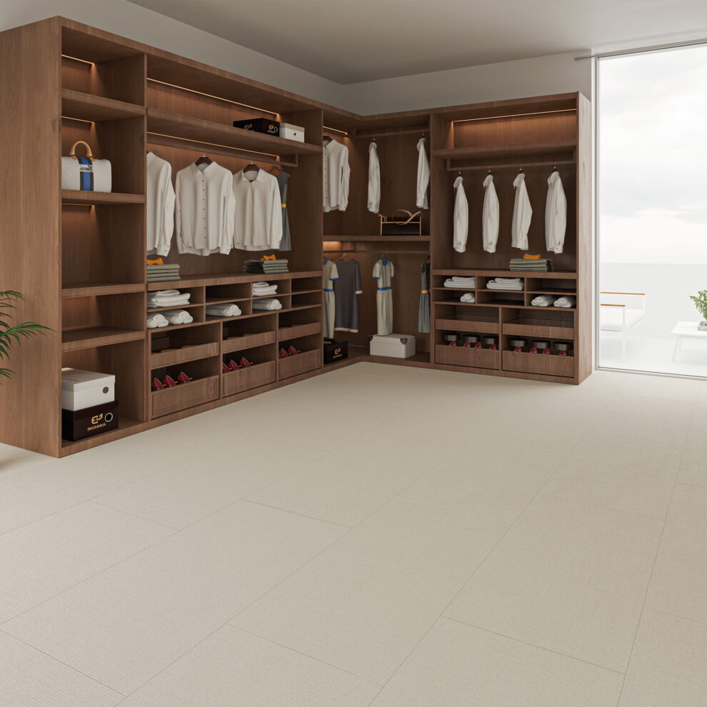 Ce design à la finition textile simule parfaitement un tissu. La teinte claire donne une impression de chaleur et de confort. Son grand format de 120 x 60 mm simule les carreaux de céramique. Il convient aux salles de bains et aux cuisines. L’installation est très simple et pratique.